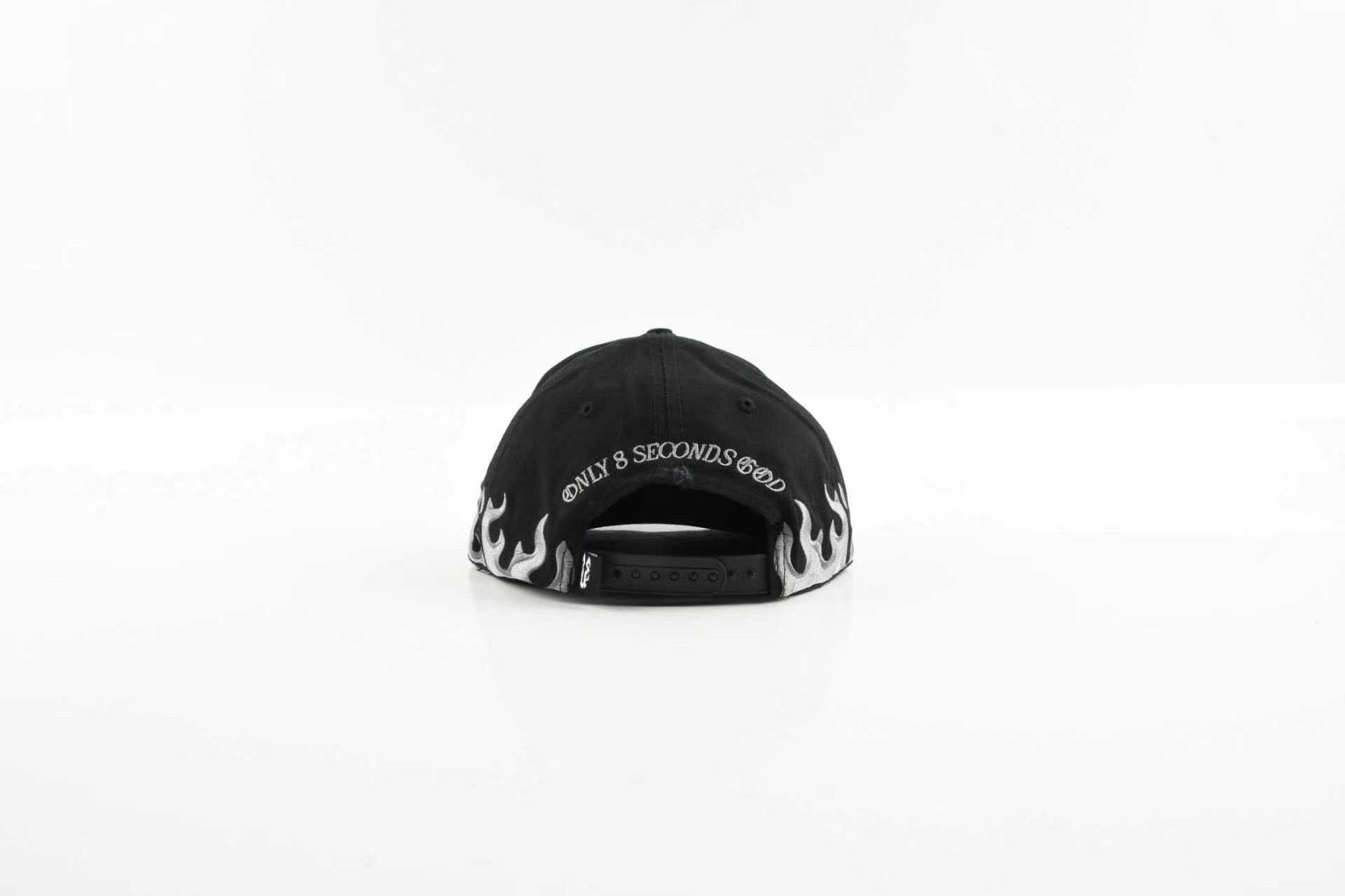Silver-to-white flame embroidery wraps around the sides and visor, giving the hat a powerful, aggressive edge that stands out from every angle. The brim carries the same flame pattern underneath, adding that extra punch when the hat tilts forward.