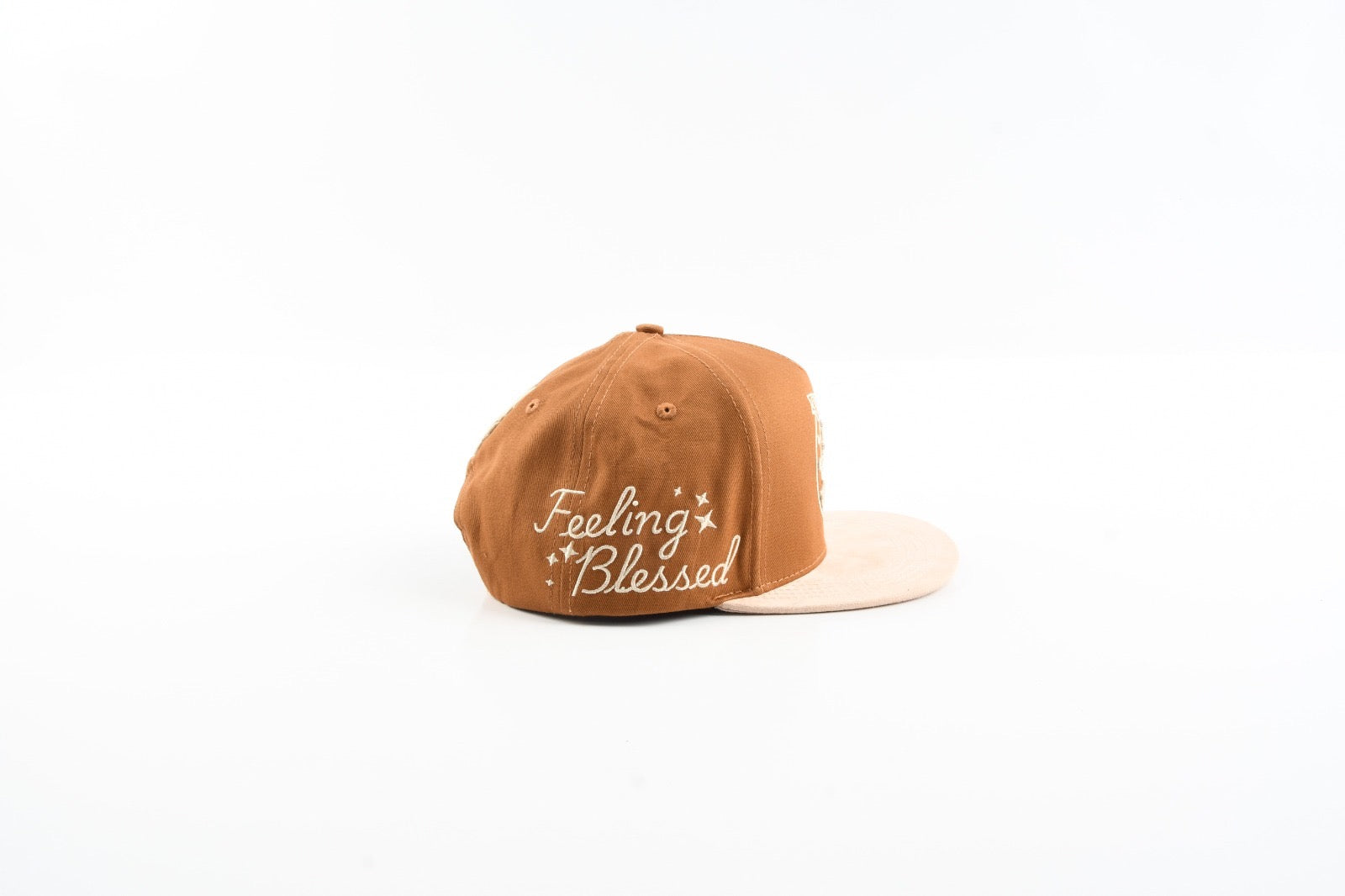 Crafted in warm earth colors with a contrasting flat bill, this snapback blends western and outdoor aesthetics with a subtle touch of luxury. The front features a detailed embroidered horseshoe emblem, symbolizing luck and strength, while the side embroidery reads “Feeling Blessed”—a quiet reminder of gratitude and intention.