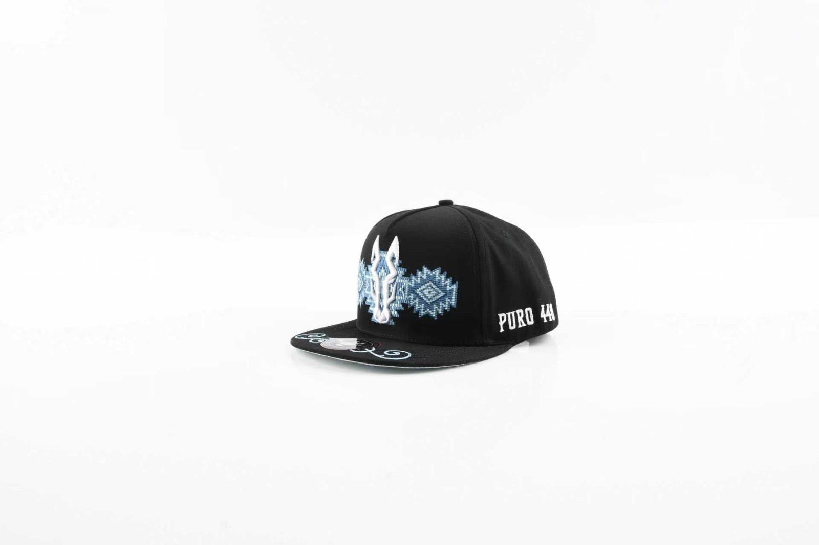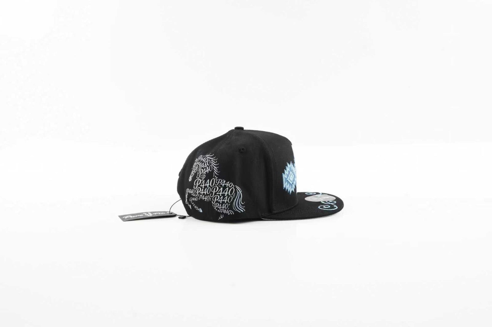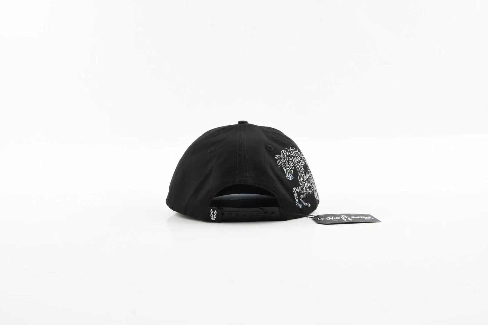 The black crown keeps the look sleek, while the visor features detailed embroidery in matching frost tones, adding flow and movement to the design. The sides carry the clean PURO 440 mark, and the opposite panel is covered with artistic script-style P440 graphics, creating a premium custom look.