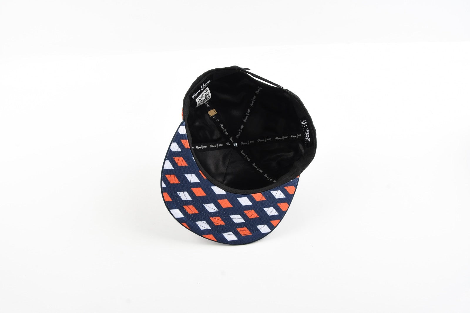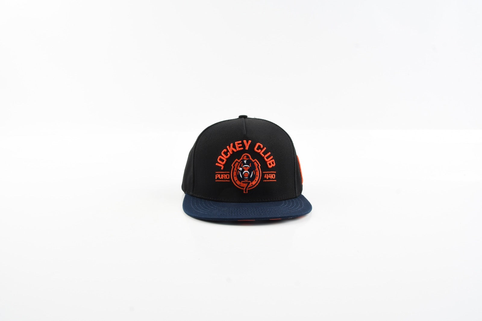 The Midnight Blaze Cap – Puro 440 hat blends racing heritage with bold modern energy. Featuring a sharp black crown with striking ember-orange 3D embroidery, this piece highlights the iconic Puro 440 horse emblem front and center. A navy brim anchors the design with a clean, athletic contrast, while the underside pops with a custom diamond-pattern print in navy, white, and ember tones.