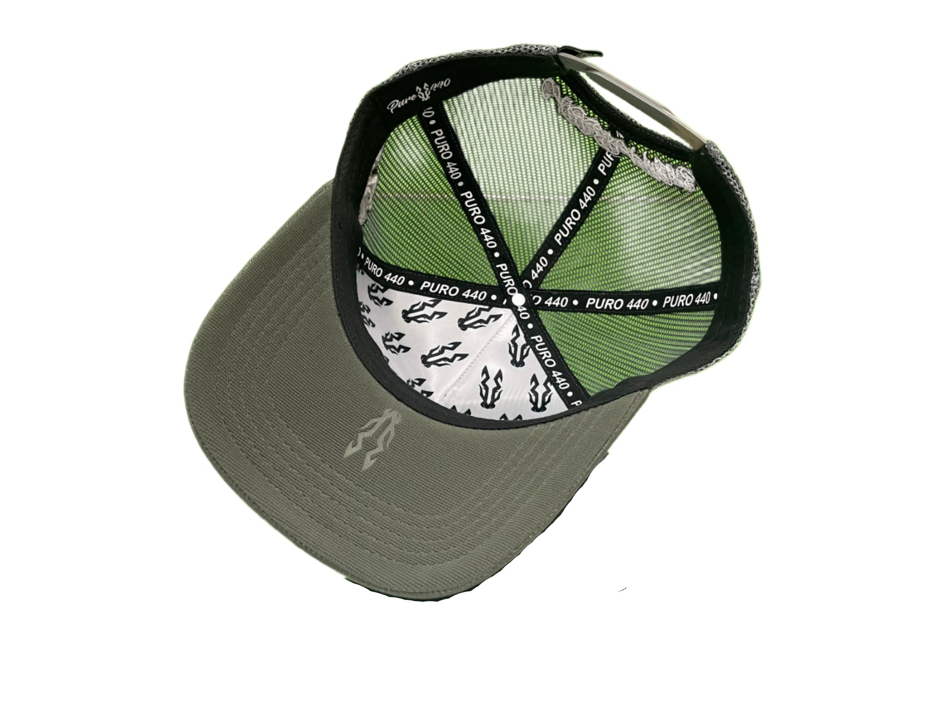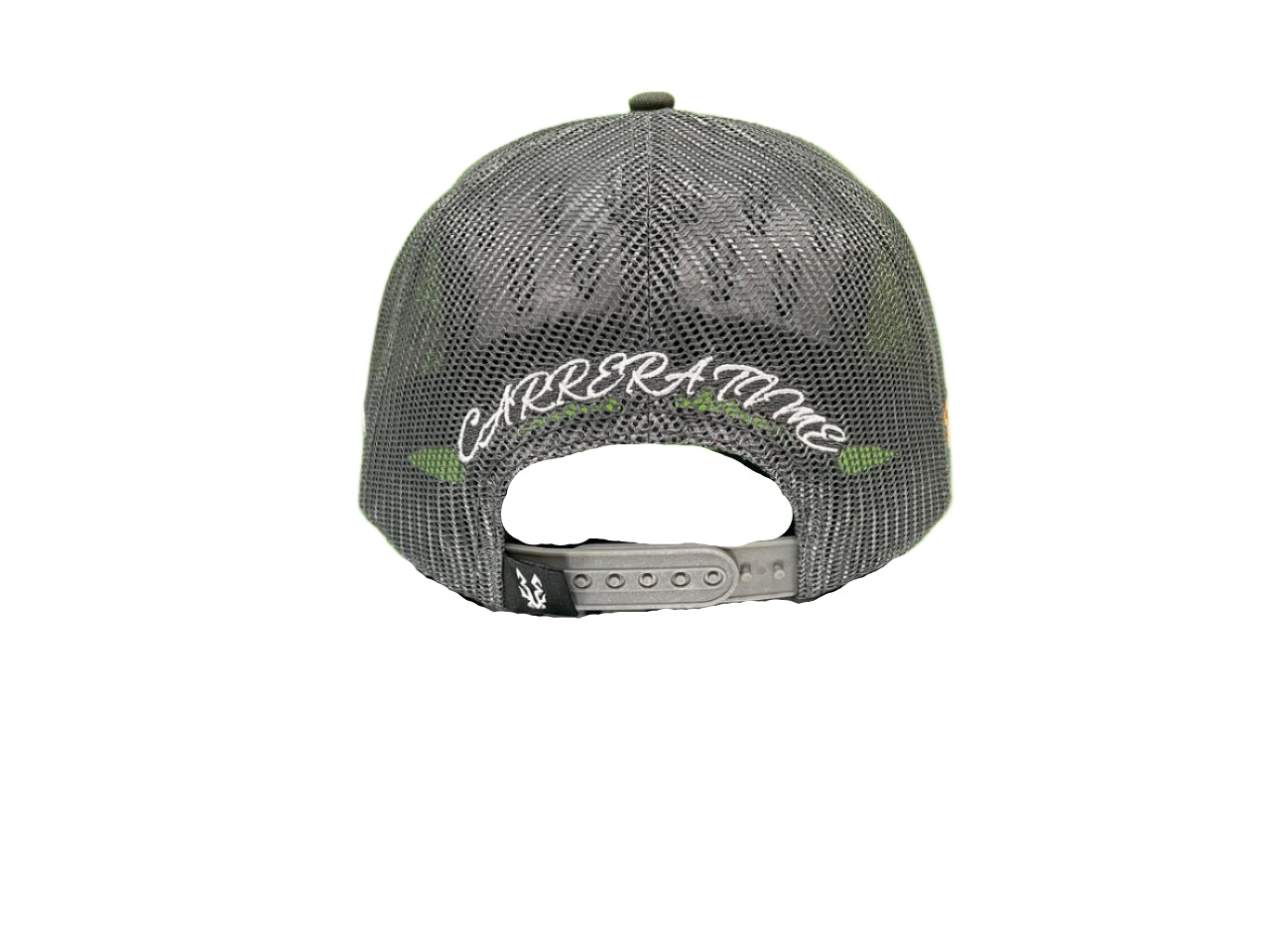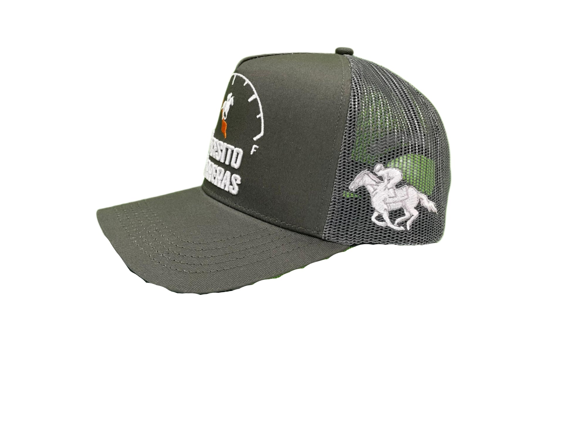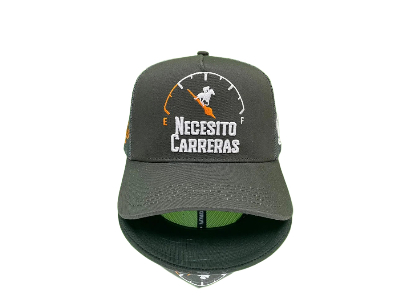 This unique grey mesh-back hat features the phrase “Necesito Carreras” (“I Need Races”) embroidered prominently on the front. It showcases a fuel gauge graphic with a horse and jockey, creatively symbolizing the passion for horse racing. The right side boasts an embroidered jockey on horseback, while the left side displays the Puro 440 logo in vibrant orange. Inside, branded details such as “Puro 440” repeat along the interior seams, adding a touch of sophistication. With breathable mesh material and an adjustable snapback closure, this hat is as functional as it is stylish, perfect for racing enthusiasts and everyday wear.
