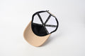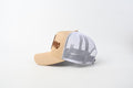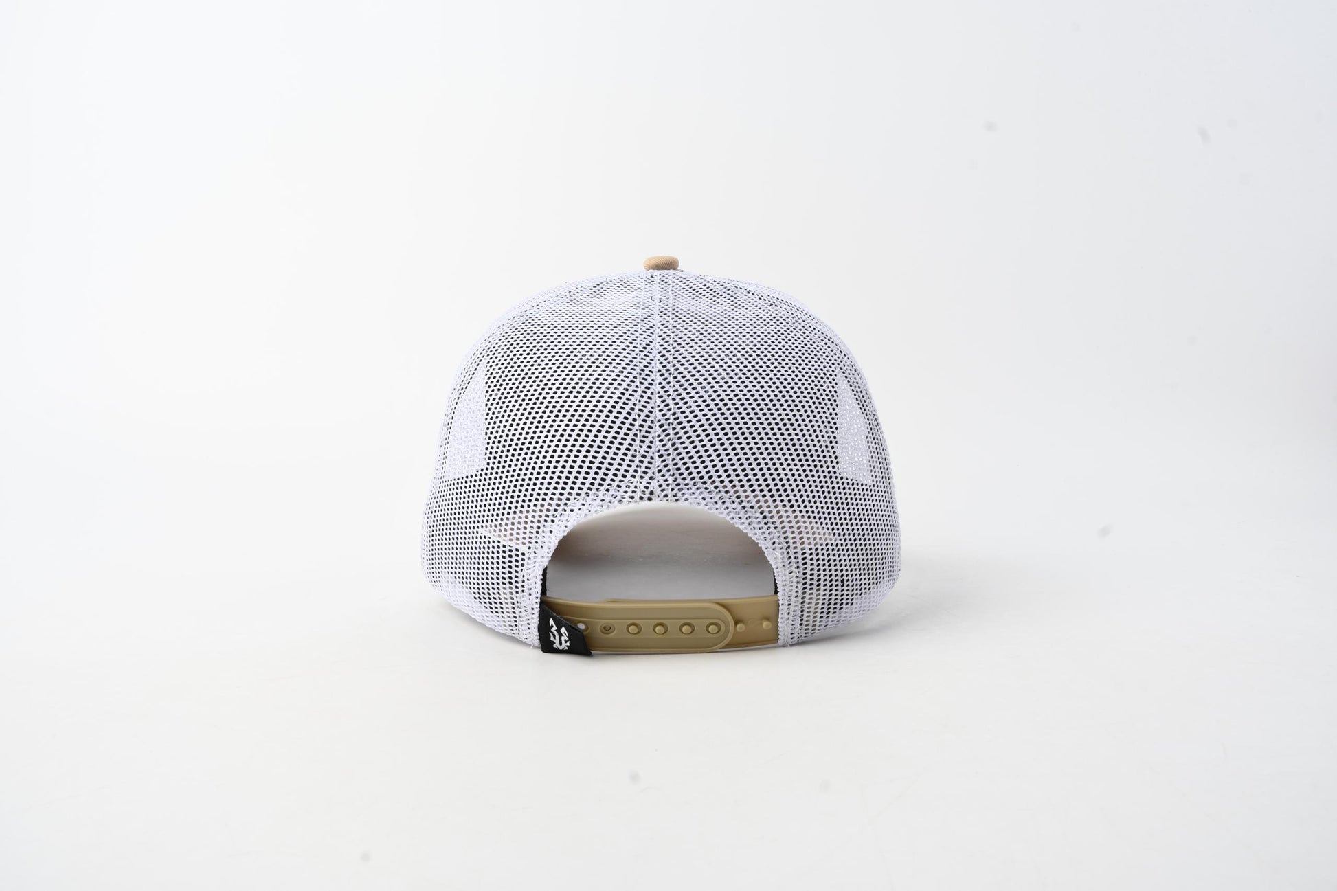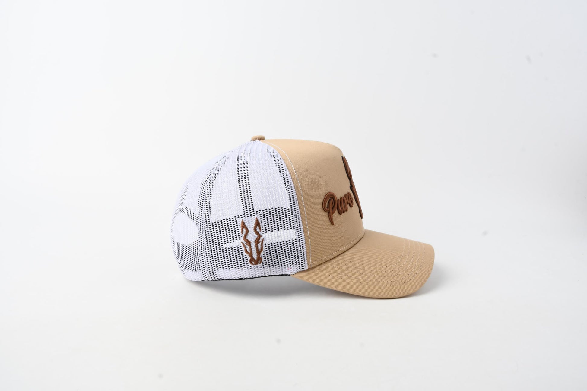 This tan trucker hat features a structured front panel made of durable material with brown embroidered accents. The embroidery includes a trident-like emblem centered between the words "Puro" and "440," giving the hat a bold and distinctive look. The white mesh back offers breathability and ensures comfort during wear, while the adjustable snapback closure in beige provides a customizable fit for various head sizes. Its minimalist yet stylish design makes it suitable for casual outings or outdoor activities, blending functionality with aesthetic appeal. The curved brim offers added sun protection, making it both practical and fashionable.