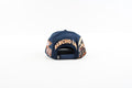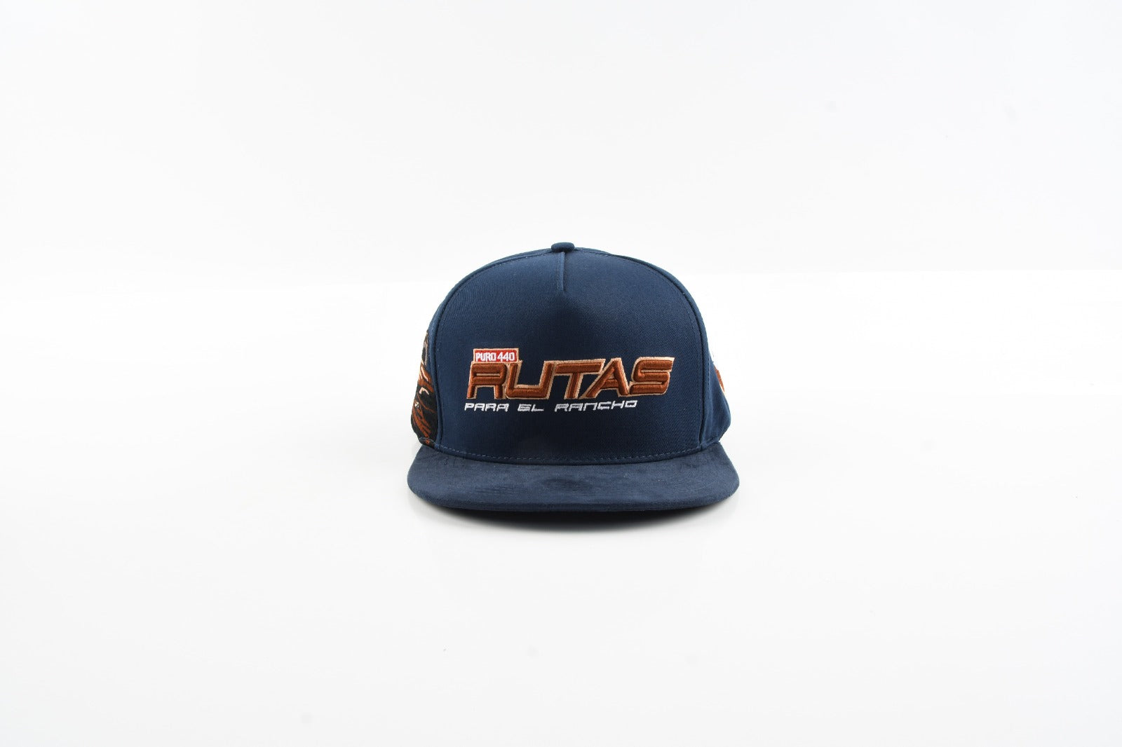 The RUTAS PARA EL RANCHO hat celebrates the dirt, the drive, and the deep roots of ranch life. Built in a matte navy crown with rich copper embroidery, this piece blends motorsport precision with rustic authenticity.