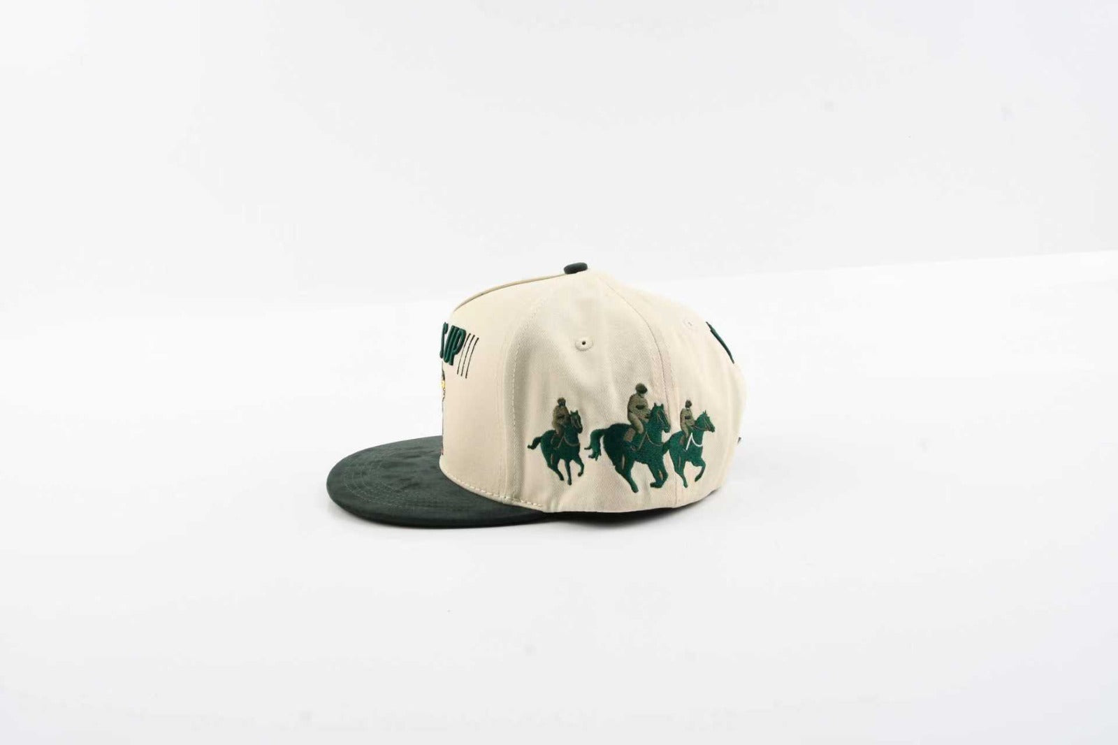 Designed in a clean cream crown with deep green accents, this flat bill snapback features bold “RIDER’S UP!!!” front embroidery paired with a playful jockey illustration, paying homage to the call that signals the race is about to begin. The structured crown delivers a sharp, premium silhouette, while the contrasting green flat bill adds depth and balance to the design.
