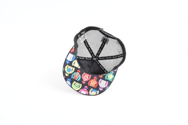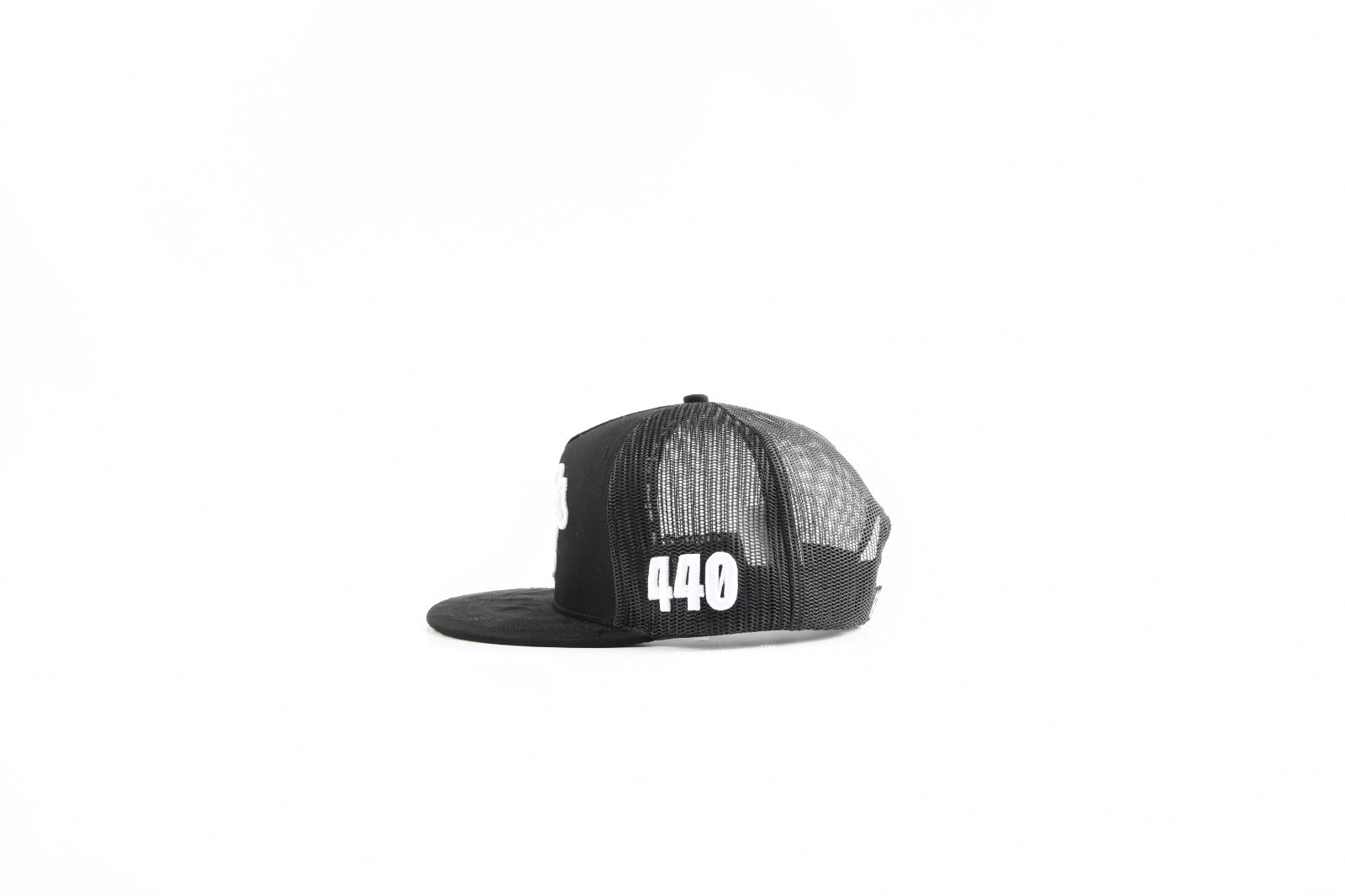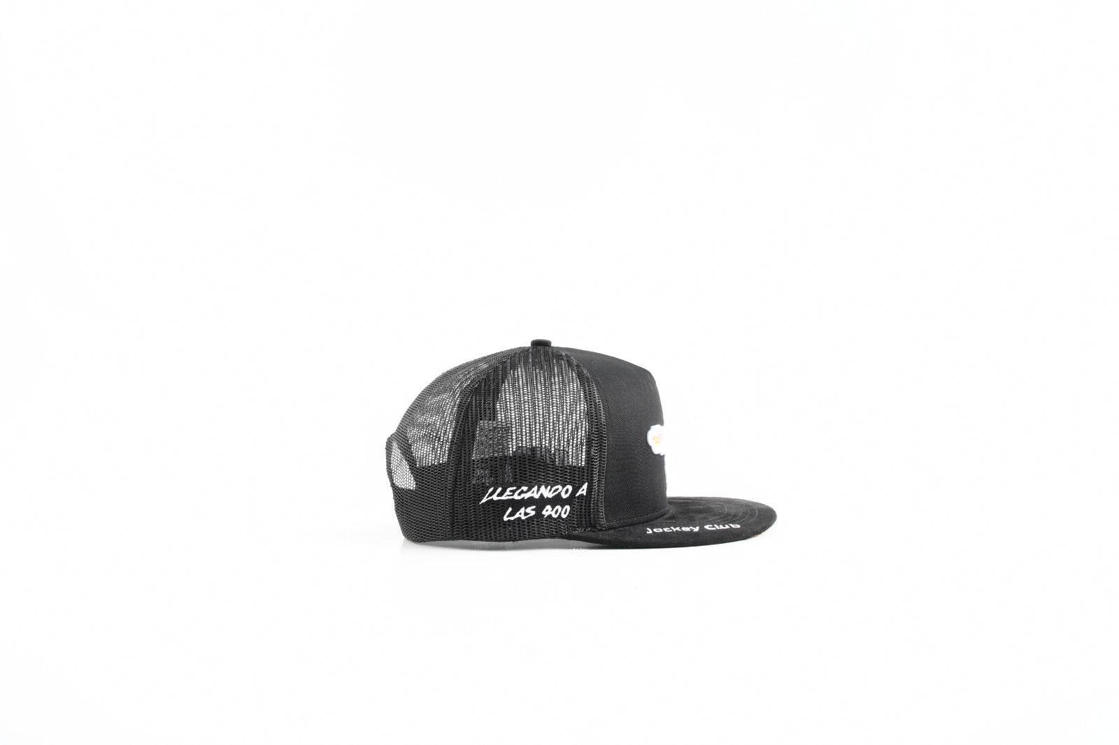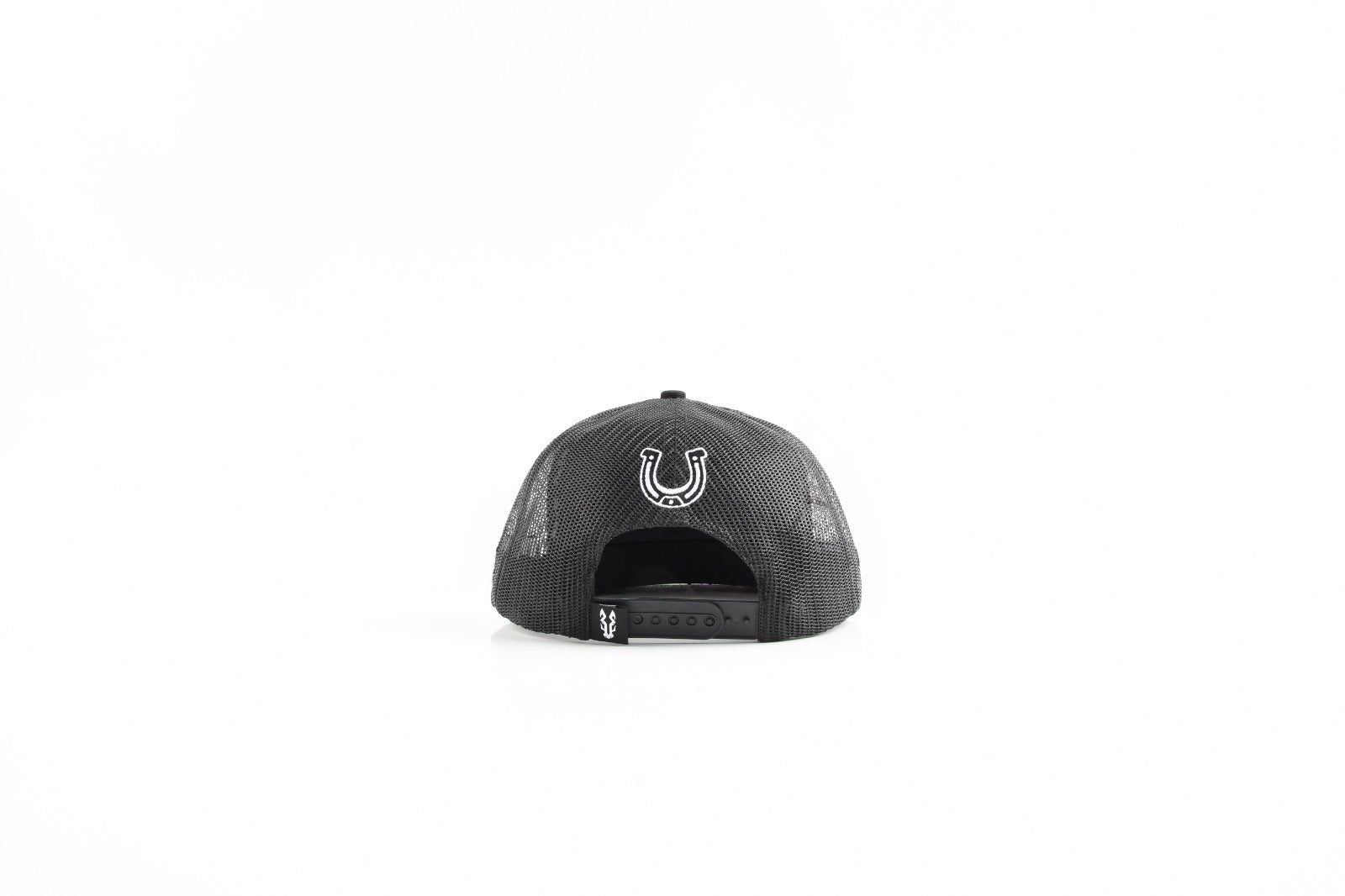 Crafted on a black flat-brim trucker with breathable mesh backing, it delivers a clean ranch-street look with premium details: